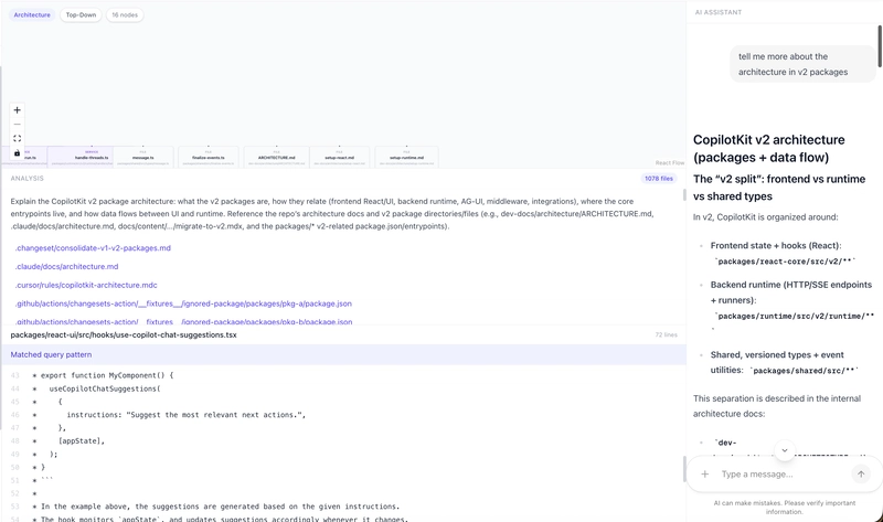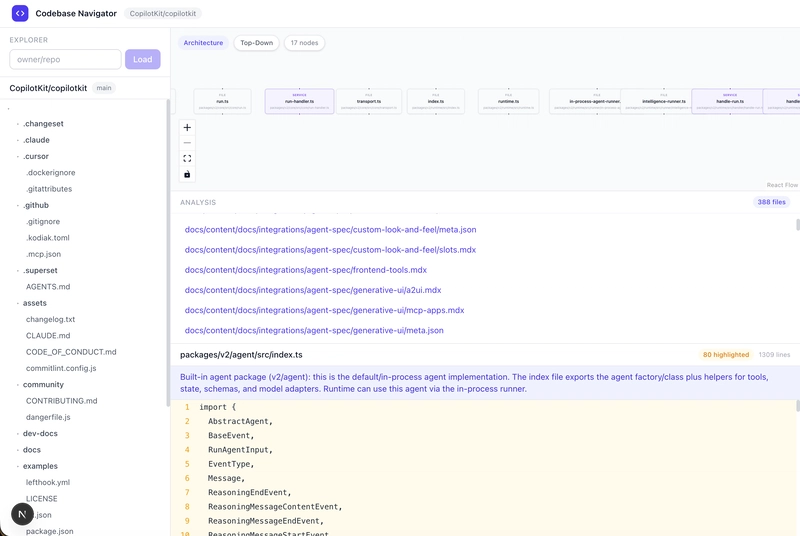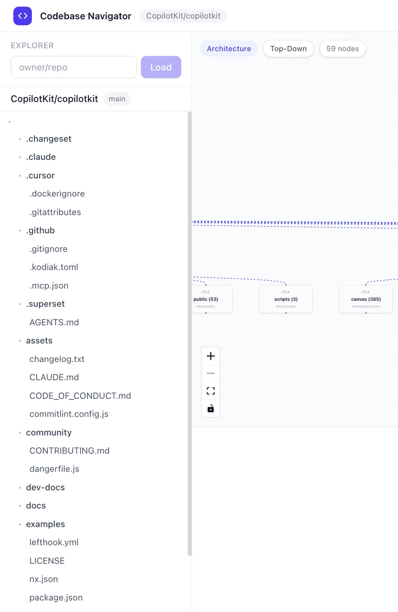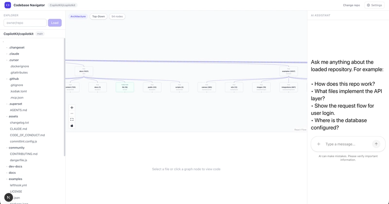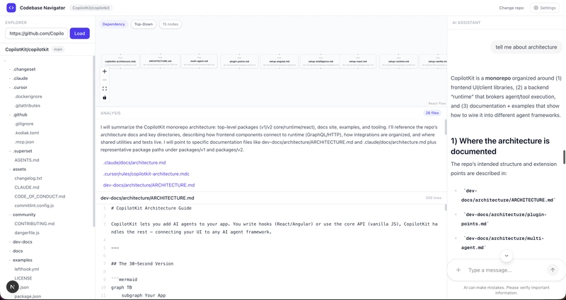 I tried it with the CopilotKit GitHub repo and it immediately maps out the entire repo structure.