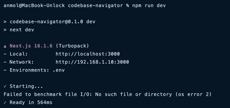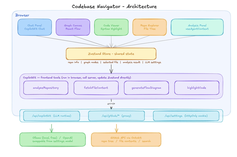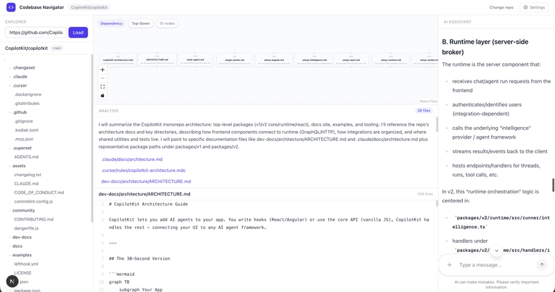 Codebase Navigator lets you paste any public GitHub repo URL and ask questions about it in plain English. Instead of getting a wall of text back, you get four panels that all update at once.
