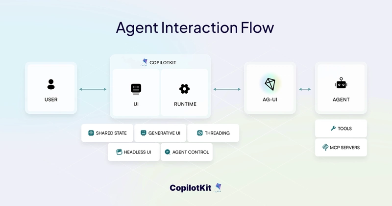 CopilotKit - agent-UI state sync and chat interface. provides built-in hooks & components like