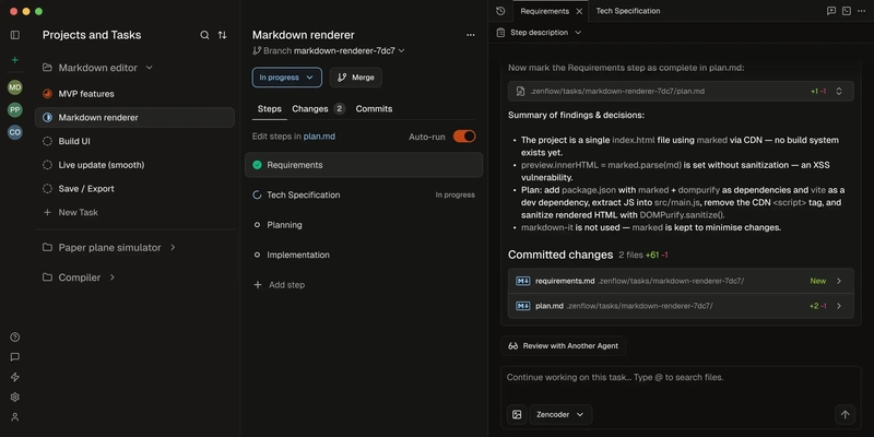The .zenflow/ folder in the repo contains the task plan, spec, and report files it generated along the way.