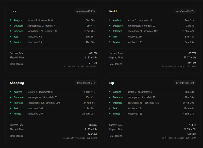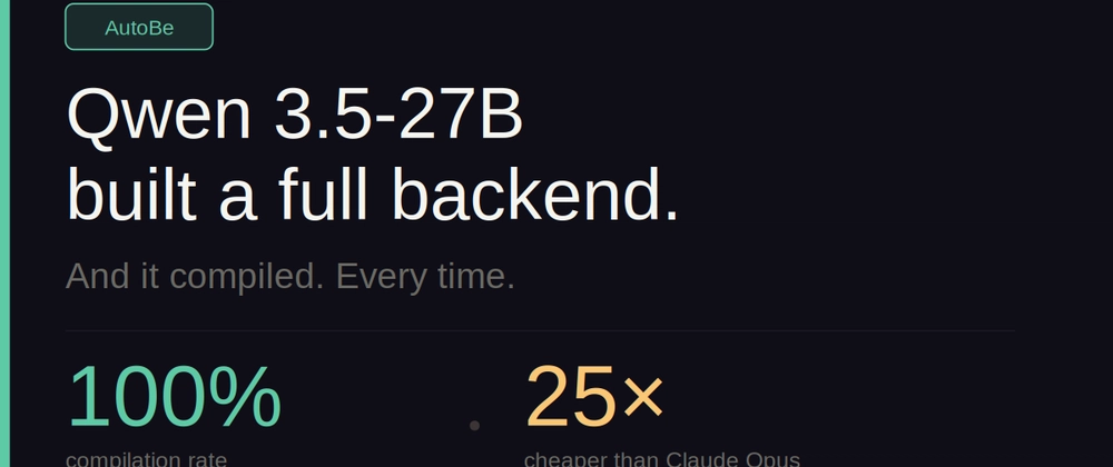 We ran Qwen 3.5-27B on 4 backend generation tasks — from a todo app to a full ERP system. Every single project compiled. The output was nearly identical to Claude Opus 4.6, at 25x less cost.
