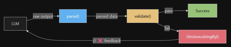 AutoBE uses Function Calling. Instead of free-form text, the LLM fills in a predefined JSON Schema—an AST (Abstract Syntax Tree). It's not writing on a blank page; it's filling in a form. Once the form is filled, a compiler validates it and transforms it into actual code. The LLM fills in the structure; the compiler writes the code.