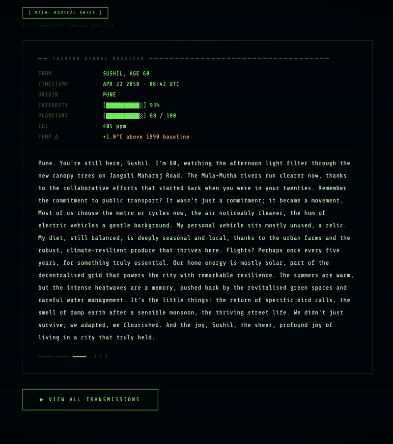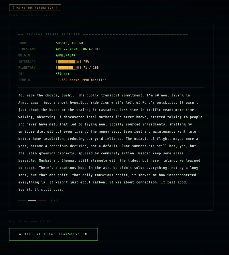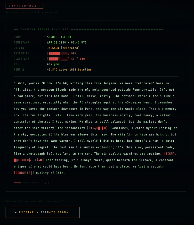 TACHYON is an AI-powered experience that shows you three possible versions of your life in 2050, based on how you live today.